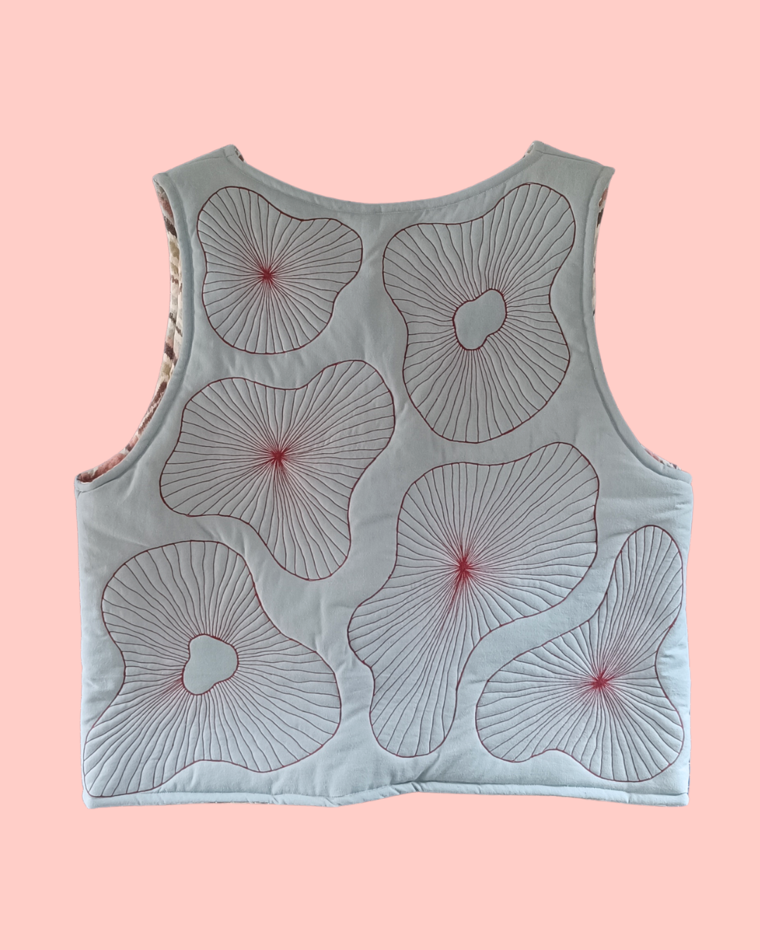 Mięciutka kamizelka pikowana w autorski wzór bordowych meduz na niebieskim tle.