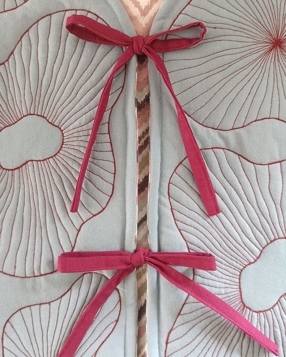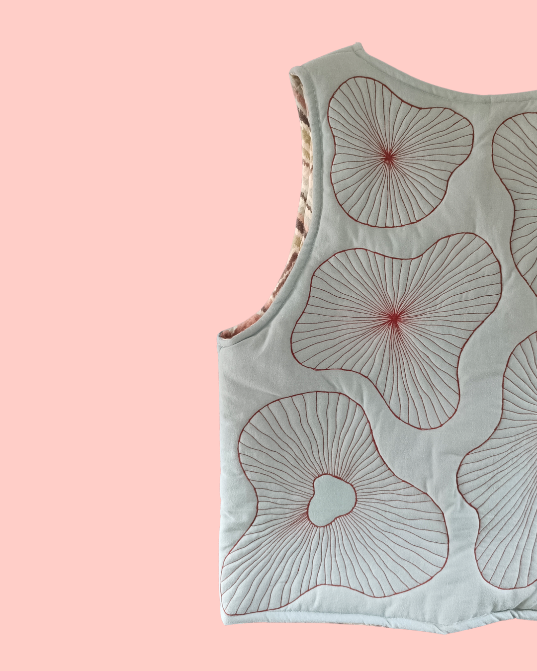 Kamizelka uszyta została z tkanin z drugiego obiegu, precyzyjnie wyselekcjonowanych, wypranych w środku do prania dla alergików i dzieci od pierwszego dnia życia.