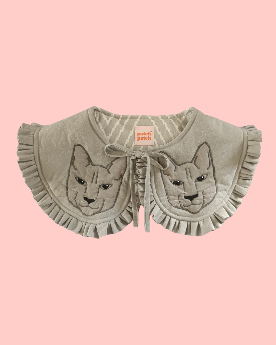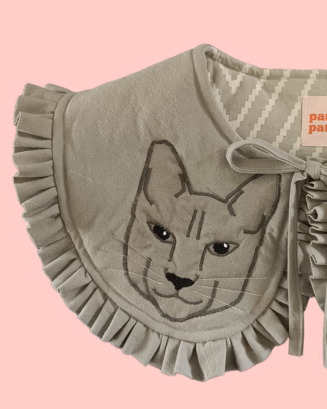 Mięciutki, wiązany kołnierzyk w autorski wzór kotów z falbanką.