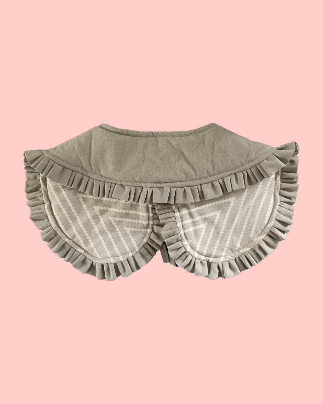 Kołnierzyk uszyty został z tkanin z drugiego obiegu, precyzyjnie wyselekcjonowanych, wypranych w środku do prania dla alergików i dzieci od pierwszego dnia życia.