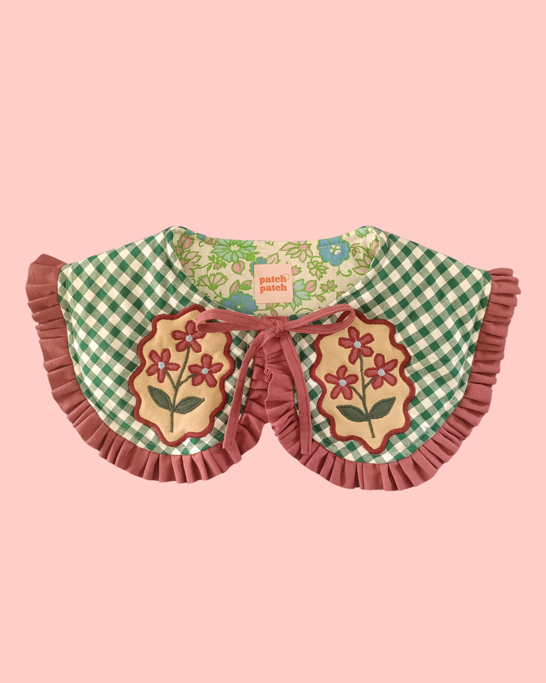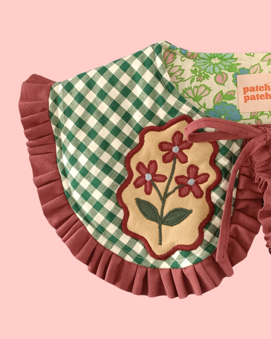 Mięciutki, wiązany kołnierzyk w autorski wzór kwiatów z falbanką.