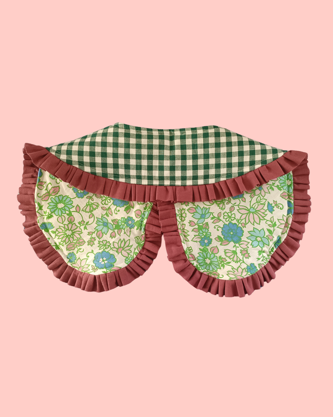 Kołnierzyk uszyty został z tkanin z drugiego obiegu, precyzyjnie wyselekcjonowanych, wypranych w środku do prania dla alergików i dzieci od pierwszego dnia życia.