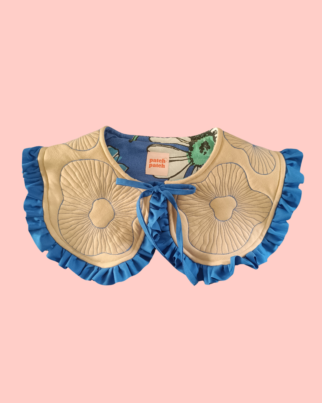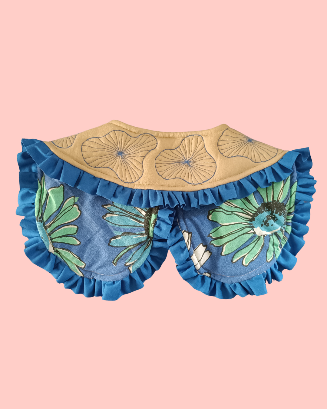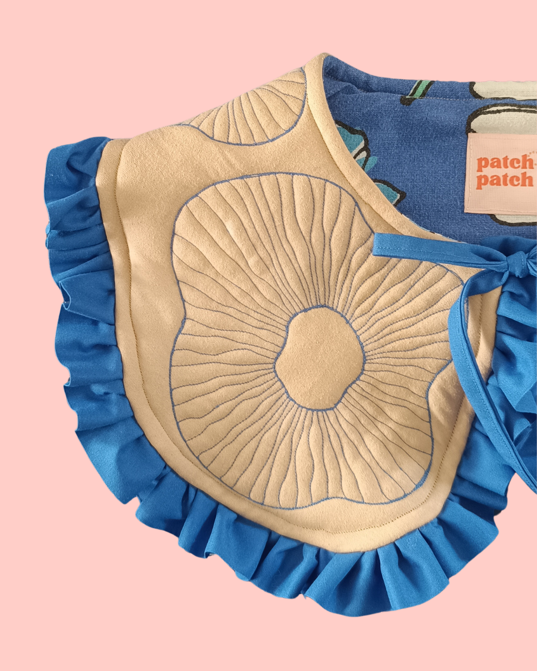 Kołnierzyk uszyty został z tkanin z drugiego obiegu, precyzyjnie wyselekcjonowanych, wypranych w środku do prania dla alergików i dzieci od pierwszego dnia życia.