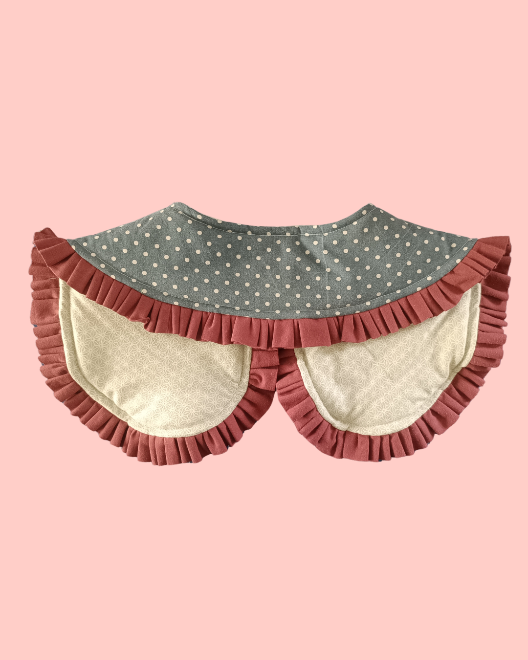 Kołnierzyk uszyty został z tkanin z drugiego obiegu, precyzyjnie wyselekcjonowanych, wypranych w środku do prania dla alergików i dzieci od pierwszego dnia życia.