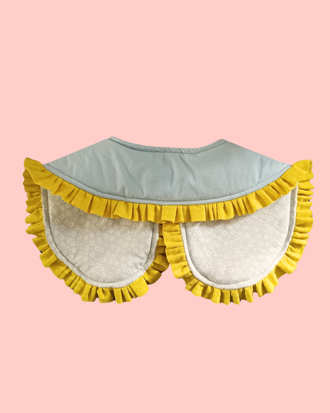 Kołnierzyk uszyty został z tkanin z drugiego obiegu, precyzyjnie wyselekcjonowanych, wypranych w środku do prania dla alergików i dzieci od pierwszego dnia życia.