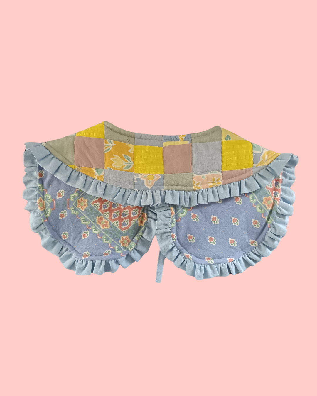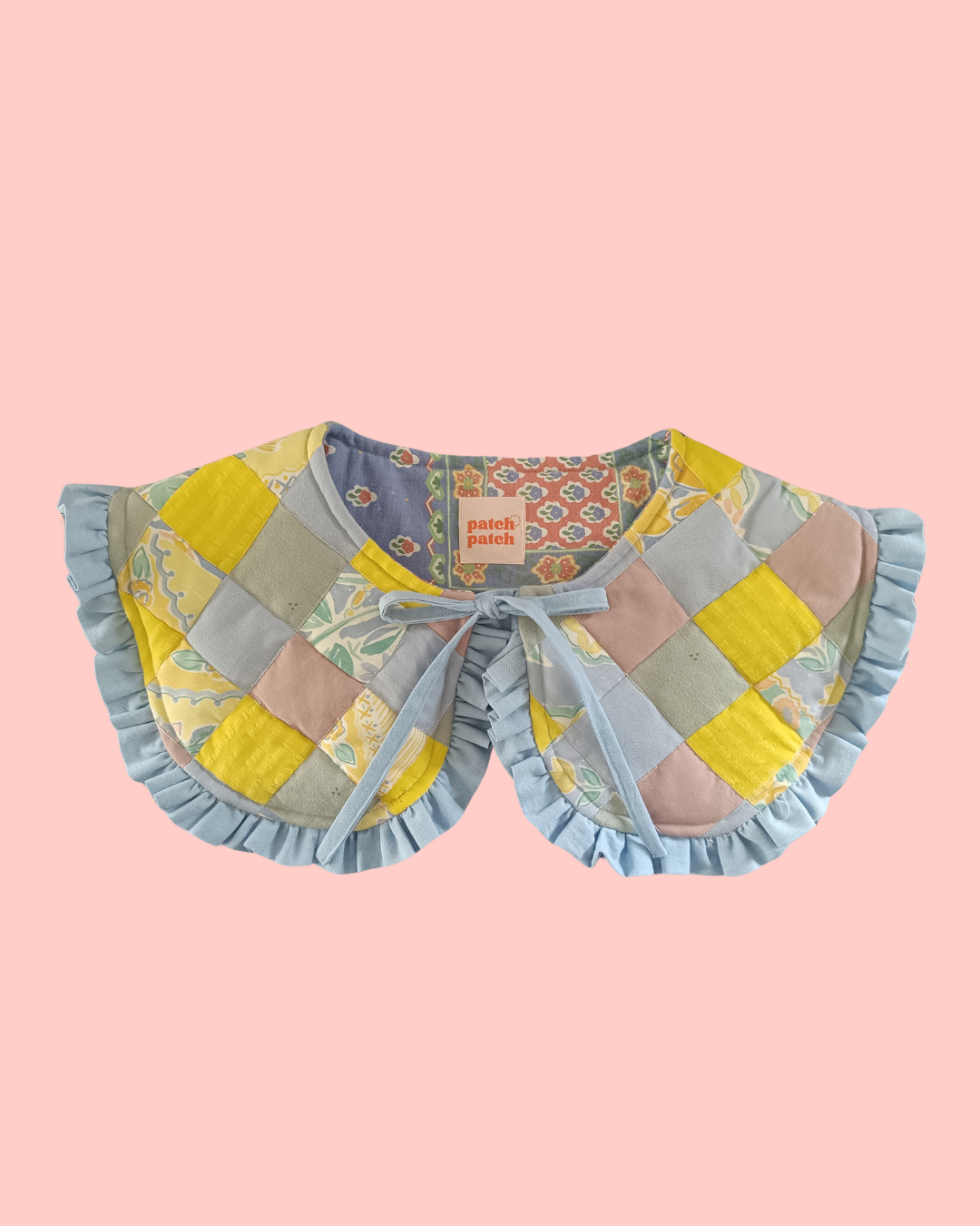 Mięciutki, wiązany kołnierzyk z kolorowego patchworku.