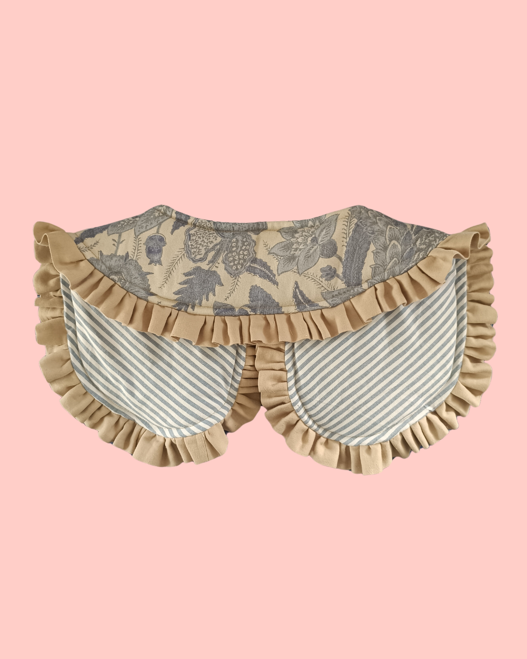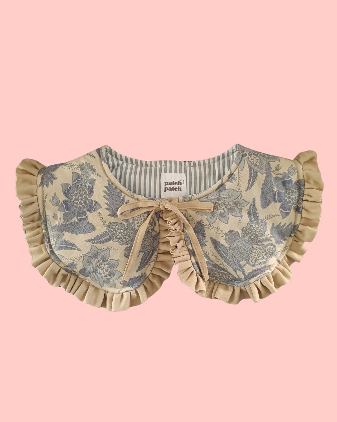Mięciutki, wiązany kołnierzyk z materiału w niebieskie kwiaty.