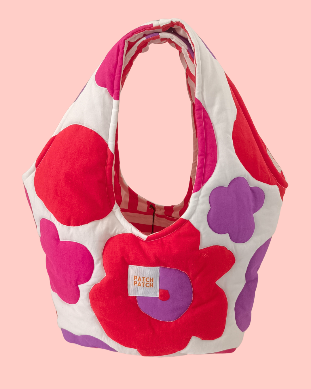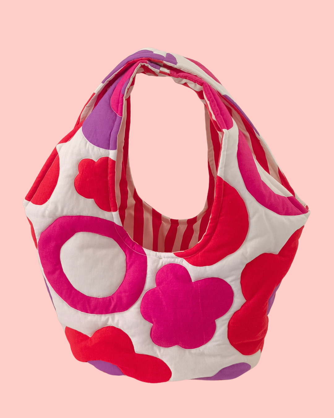 Pikowana mięciutka torba w kwiaty w kształcie wiaderka. Jest pojemna i stylowa, a w środku znajdziesz dwie duże kieszonki na telefon i inne bibeloty.