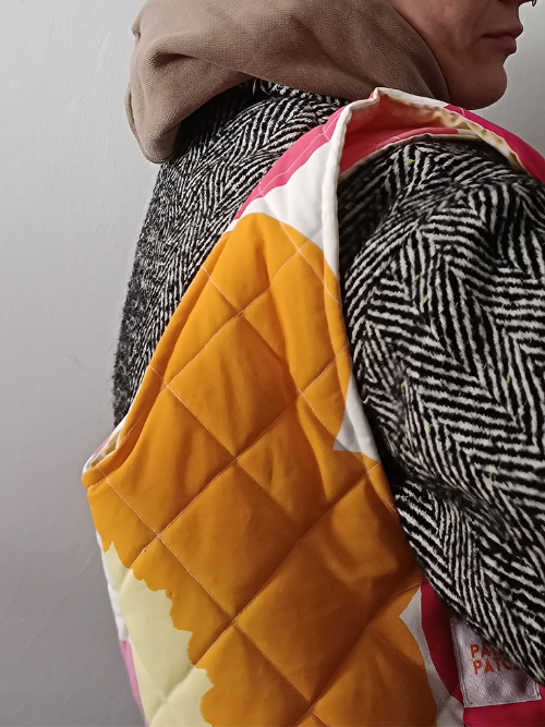 Torba uszyta została z tkanin z drugiego obiegu, precyzyjnie wyselekcjonowanych, wypranych w środku do prania dla alergików i dzieci od pierwszego dnia życia.